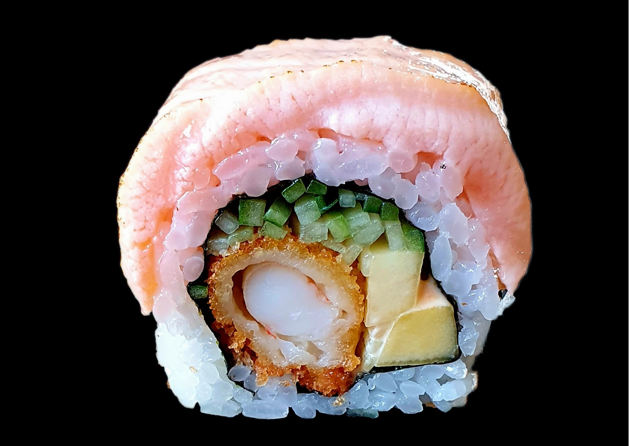 8 x uramaki gold krewetka w tempurze otulona łososiem opalanym